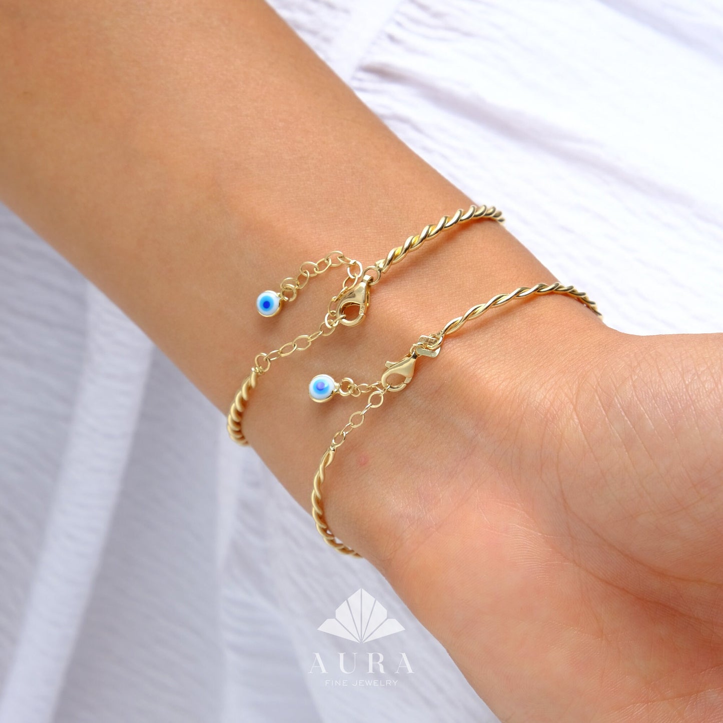 14K Gold Bangle Bracelet, Double Twisted Rope Stacking Bangle Bracelet, Evil Eye Charm, Gold Wire Twisted Bangle, Cable Bangle Bracelet, Gift For Her Women